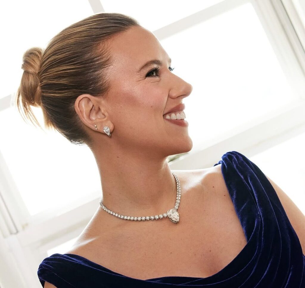Classico che più classico non si può. Ma Scarlett Johansson è perfetta con il suo look pulito e i gioielli importanti ma non eccessivamente vistosi di De Beers.