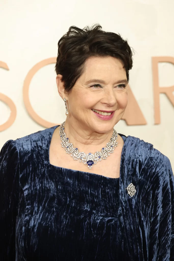 Sembra una regina Isabella Rossellini, e di certo i gioielli contribuiscono al look regale. L’attrice ha indossato una collana Bvlgari in platino, uno zaffiro Royal Blue e zaffiri e spilla in diamanti High Jewelry, un anello High Jewelry in oro rosa e diamanti. Per completare il look l’attrice ha indossato un paio di orecchini vintage Bvlgari appartenuti a sua madre, Ingrid Bergman ed indossati da quest’ultima quando vinse l’Oscar per il ruolo di miglior attrice nel 1975. Gli orecchini erano un regalo di suo marito, Roberto Rossellini, ed indossati dall’attrice nel film ‘Viaggio in Italia’ .
