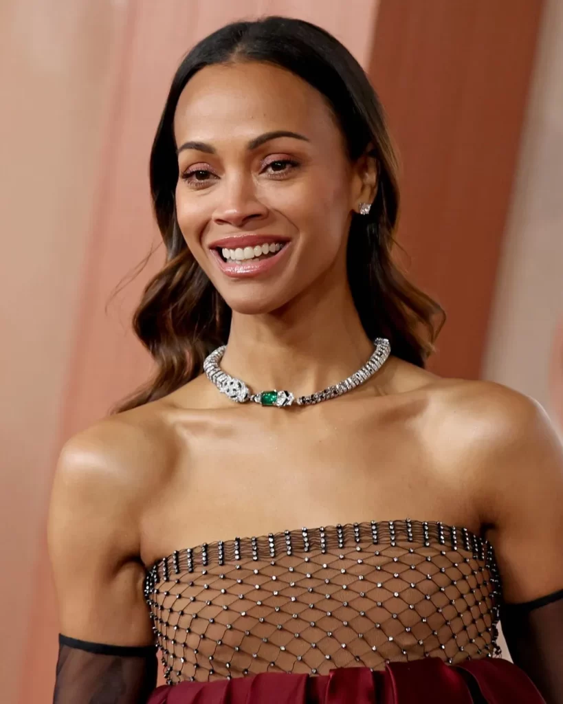 La vincitrice del premio Oscar 2025 Zoe Saldaña indossa la collana Cartier Panthères Versatiles della collezione di alta gioielleria Nature Sauvage, realizzata in oro bianco e incastonata con uno smeraldo cabochon dello Zambia da 10,10 carati, onice e diamanti
