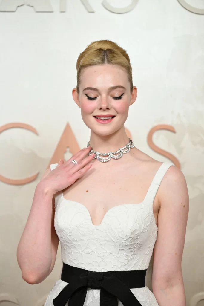 Elle Fanning sfoggia un collier dalla singolare forma drappeggiata che decora il suo collo immacolato. Sembra un dipinto.