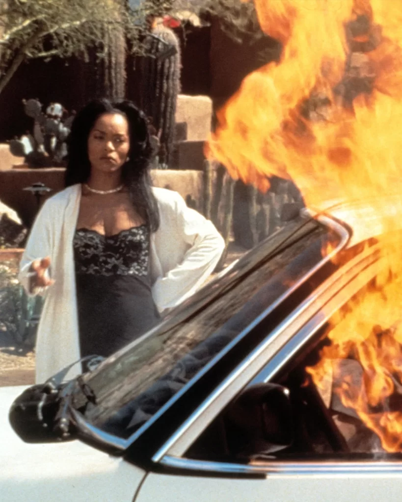 1995: Angela Bassett’s Diamond Jewelry in Waiting to Exhale Waiting to Exhale follows the lives of four friends played by Whitney Houston, Angela Bassett, Loretta Devine, and Lela Rochon. After Bassett’s character Bernadine is betrayed by her husband, she loads up his car with his entire wardrobe, pours on the gasoline, lights a cigarette, and sets his car on fire, making for one of the most legendary revenge scenes in cinematic history. Wearing black lace lingerie under her white silk robe, Bassett accessorized with a gold and diamond choker from Bulgari.