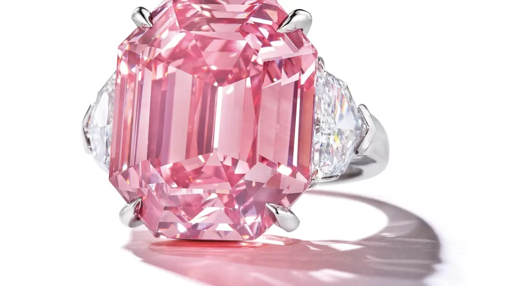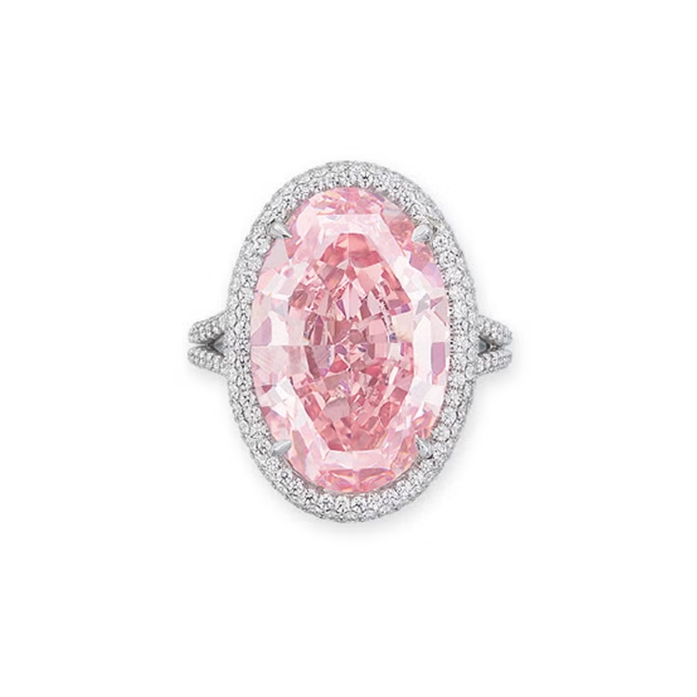 Descritta da Christie’s come “il Picasso del mondo dei diamanti rosa”, questa pietra rosa vivido fancy da 14,93 carati ha raggiunto un valore di oltre 30 milioni di dollari. Oltre al suo eccezionale colore rosa, la sua forma è inconfondibile. “Quando si osserva la forma della pietra, è così elegante”, afferma Rahul Kadakia, responsabile internazionale della gioielleria della maison. “È un incrocio tra un ovale e un marquise, quello che noi chiamiamo un moval”.