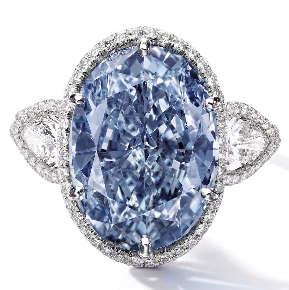 Un diamante blu vivido è raro di per sé, ma quando pesa più di 10 carati ed è di forma ovale, è ancora più eccezionale. Ecco perché questo anello con diamante blu vivido da 10,10 carati, affiancato da due diamanti a forma di pera, è stato venduto per oltre 30 milioni di dollari.